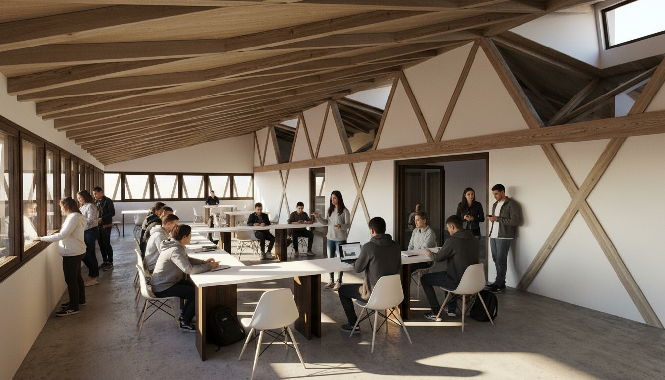 Das Dachtragwerk wurde so konzipiert, dass ein Großteil der Lasten über die Außenwände bzw. linienförmig abgeleitet werden, um zusätzliche Stützen im Inneren des Bestandsgebäudes zu vermeiden. Auskragungen werden durch das Ergänzen von Wandpfeilern im Außenbereich wirtschaftlich abgefangen. Die geringen Spannweiten ermöglichen die Verwendung von KVH statt Leimholz und die Fachwerkskonstruktion kann mit zimmermannsmäßigen Verbindungen realisiert werden.